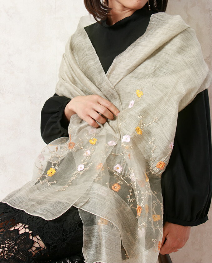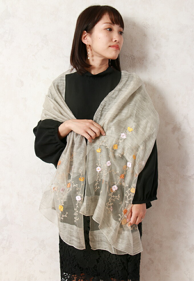 Details 肌当たりの良いシャリ感のある生地の花柄刺繍ストール。