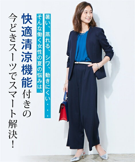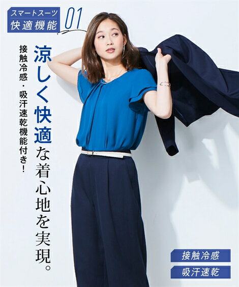 真夏をおしゃれに乗り切る為のうすカル高機能スーツ・夏ならではの悩みに対応して快適な吸汗速乾・接触冷感性のある生地を使用し、更に動きやすさも重視してタテヨコストレッチ性もプラス。